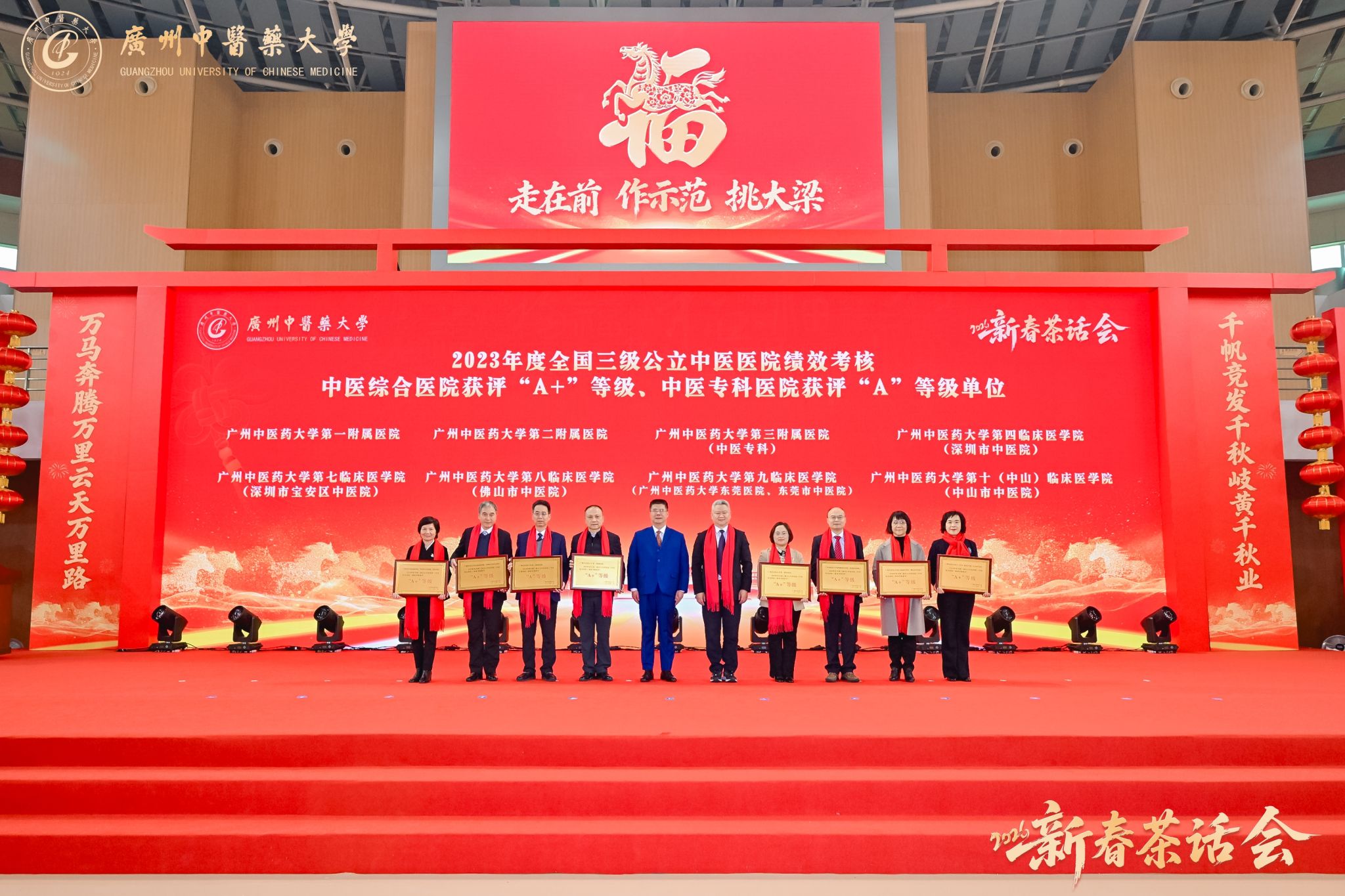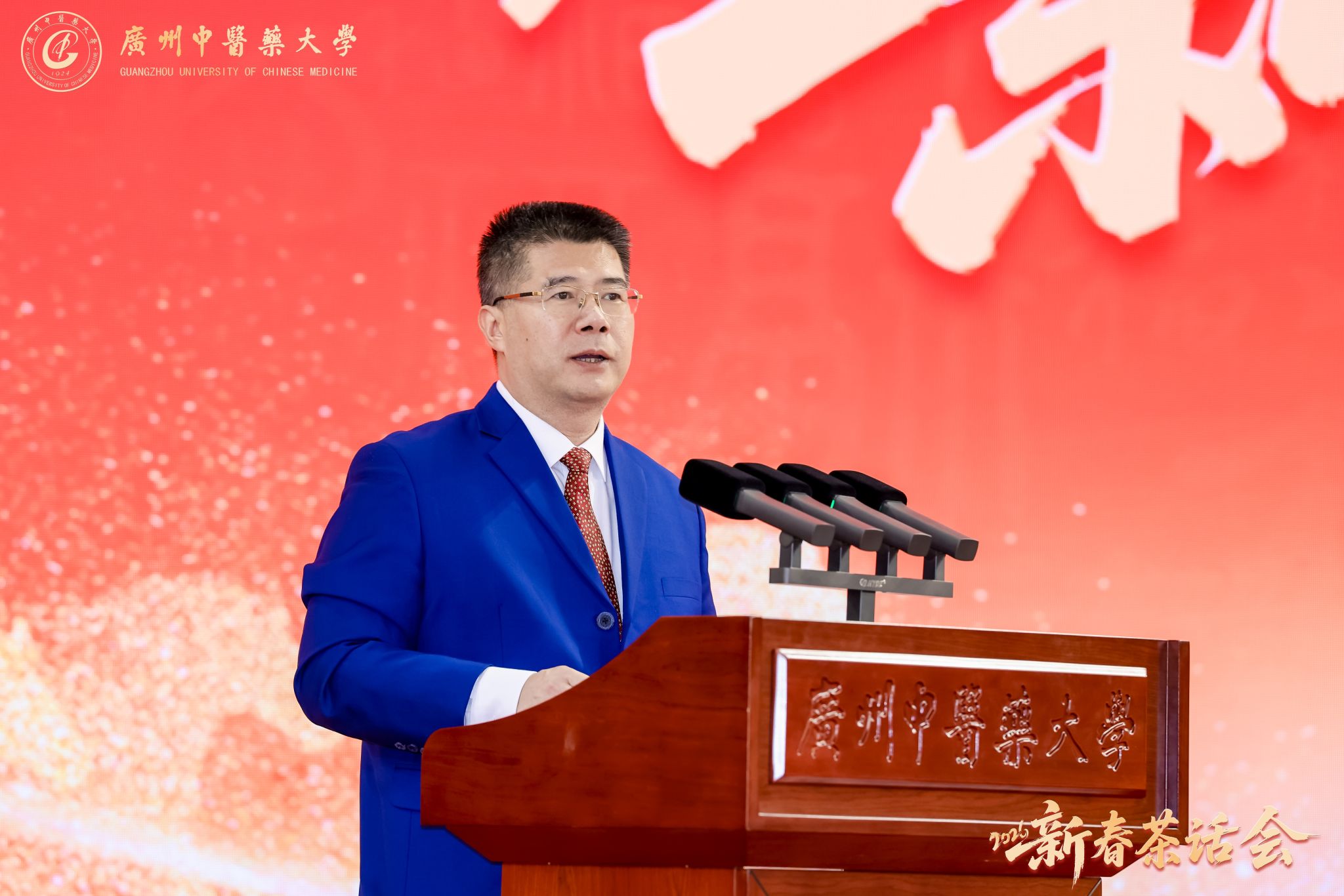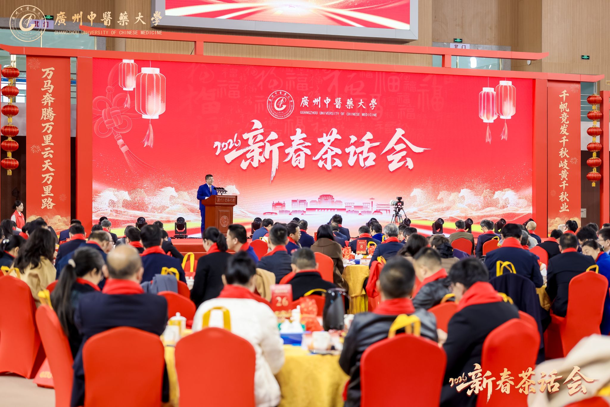 万马奔腾启新程,千秋岐黄续华章。2026年1月23日,广州中医药大学2026年新春茶话会在大学城校区体育馆举行。学校党委书记陈文锋、校长王宏斌等学校领导班子成员,和师生代表欢聚一堂,喜迎新春佳节。茶话会由学校副校长刘中秋主持。