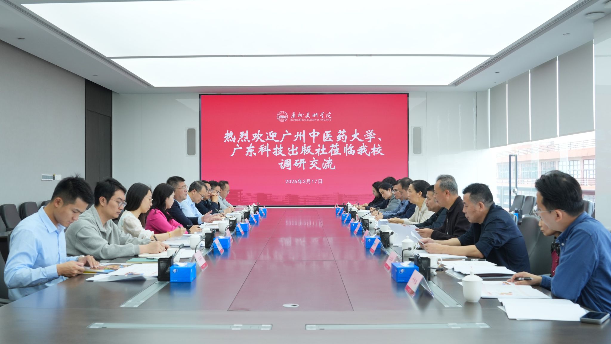 3月17日,学校党委书记陈文锋率队前往广州美术学院,就共同打造面向青少年的AI数智中医药文化产品——《中华小药童寻宝记》出版事宜进行深入交流,并达成初步合作意向。广州美术学院党委书记林蓝,党委副书记宋光智热情接待了我校一行。广东科技出版社社长罗孝政、中医药分社社长曾永琳共同出席交流活动。