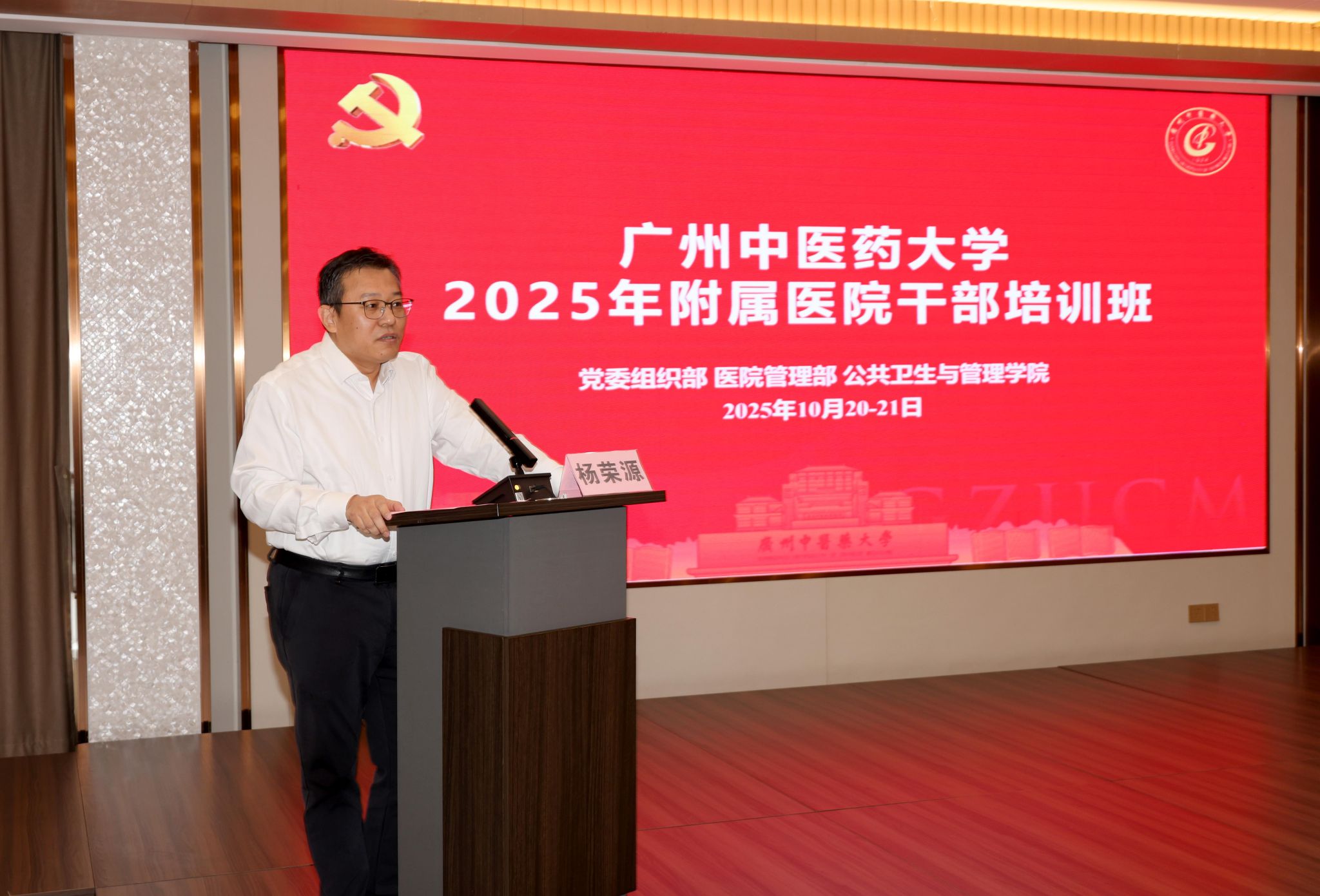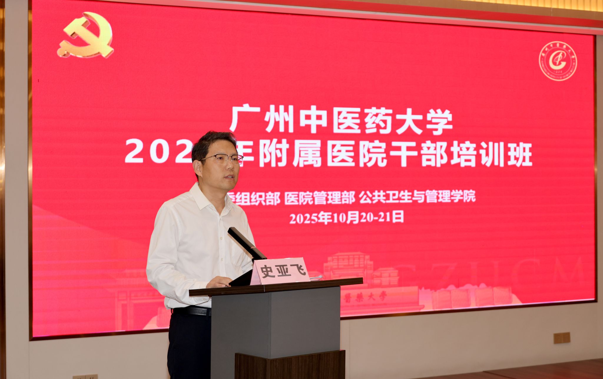 10月20-21日,广州中医药大学2025年附属医院干部培训班在清远佛冈举行。培训班由中共广州中医药大学委员会主办,党委组织部、发展规划部(医院管理部)、公共卫生与管理学院以及广东省中医药学会中医医院管理专业委员会、吕玉波教授工作室联合承办,来自22个单位的学员参加培训。广州中医药大学党委书记陈文锋出席开班式并讲话,党委常委、副校长杨荣源参加结班仪式并总结。党委常委、副校长史亚飞主持开班式。