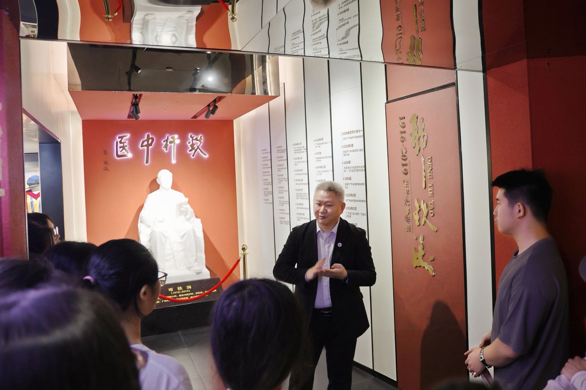 从校史的厚重篇章中走来,邓铁涛先生是与学校同成长、与中医药事业共命运的旗帜性人物。王宏斌校长带领大家走进邓铁涛纪念馆,结合其生平事迹、从医历程,系统阐述他的突出贡献。他指出,邓铁涛不仅是著名中医临床家、理论家、教育家、中医发展战略家,还是第一批国家级非物质文化遗产中医诊法代表性传承人、首届国医大师。他出身岭南中医世家,1932年以优异成绩考入我校前身广东中医药专门学校,更名“铁涛”,立下“铁肩担道义,涛声振杏林”的铮铮誓言。
